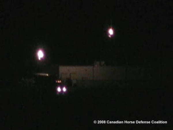 Double decker trailer unloading horses after operating hours at Natural Valley Farms horse slaughterplant in Neudorf, Saskatchewan. The unloading is done without the supervision of a Canadian Food Inspection Agency inspector which is illegal according to the US Equine Transportation to Slaughter Act and punishable by a fine of $5,000 per horse.