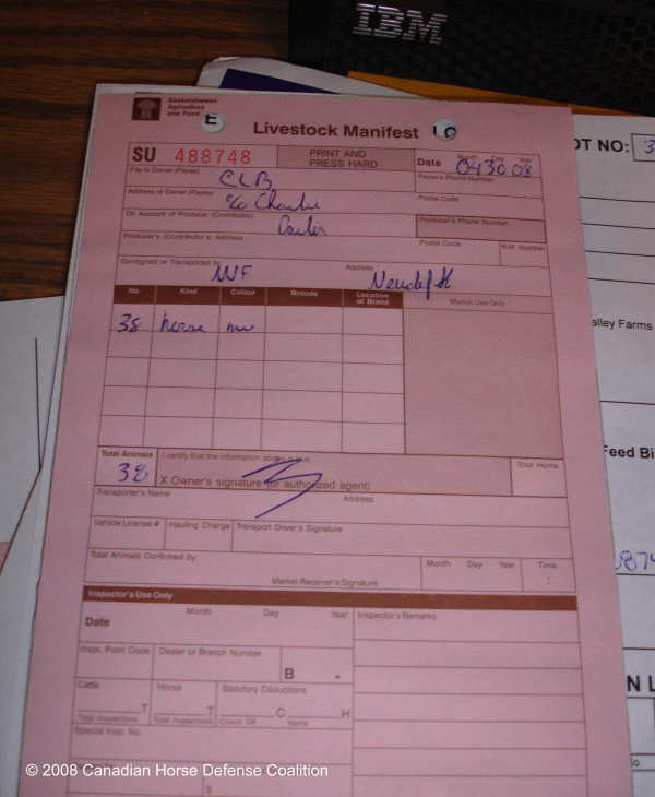 Livestock Manifest for a trailer load of horses brought in by one of Kill Buyer, Charles Carter's drivers. Charles Carter buys horses in the Colorado area.