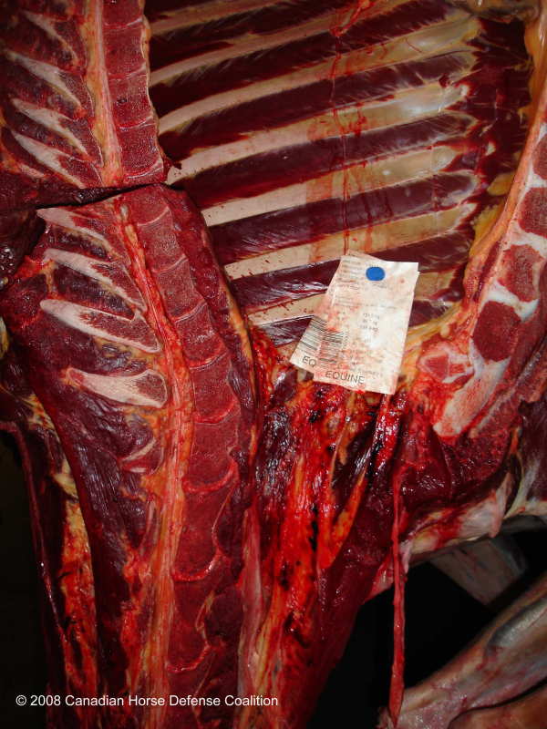 Bloody horse carcass at Natural Valley Farms horse slaughterhouse. Expiry date May 30, 2008.
