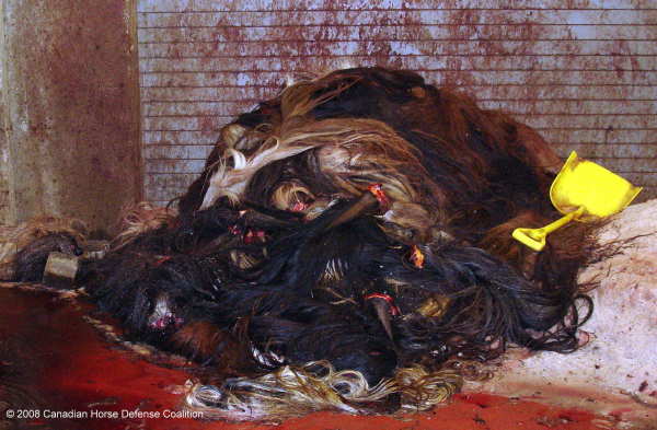 Cut off horse tails left beside a pile of salt in the basement of Natural Valley Farms horse slaughterplant in Neudorf, Saskatchewan.