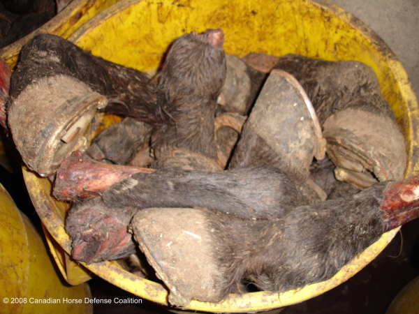 One of 4 barrels full of still-shod cut-off horse legs in the basement of Natural Valley Farms horse slaughter plant in Neudorf, Saskatchewan.
